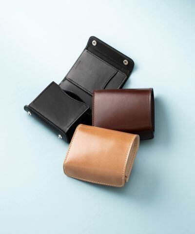 外装に新喜皮革のコードバン、美しい光沢と透明感のある艶があります。内装にはオイルを十分に染み込ませたタンニン鞣しの革を使用しています。内装、外装ともにエイジングを楽しんでいただけます。